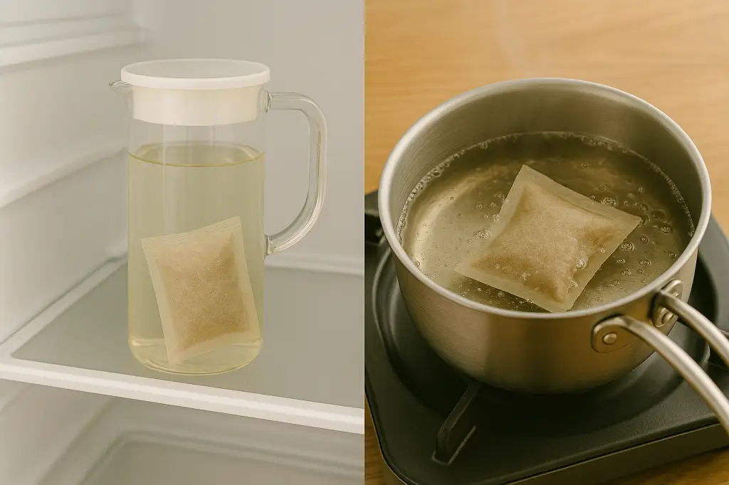 ・水出し(冷蔵庫で3~6時間):澄んだ味・香り控えめ。翌朝の味噌汁やうどんつゆに。時間はかかるが失敗が少なく、雑味のないクリアなだしが取れるのが特徴。冷蔵庫で作り置きしておくと朝食準備がぐっと楽になります。
