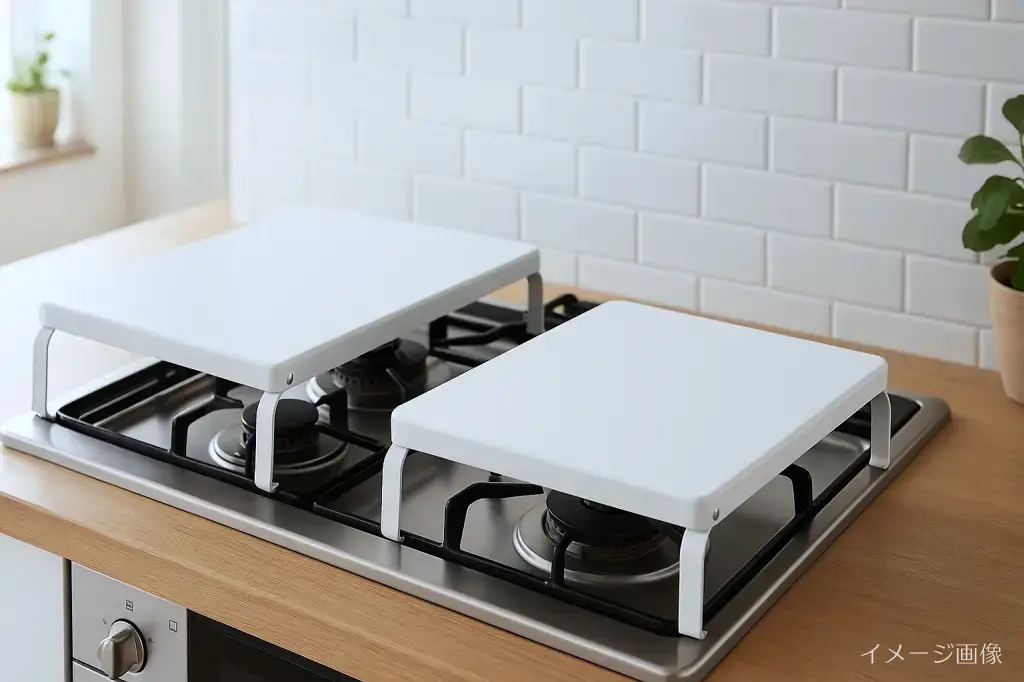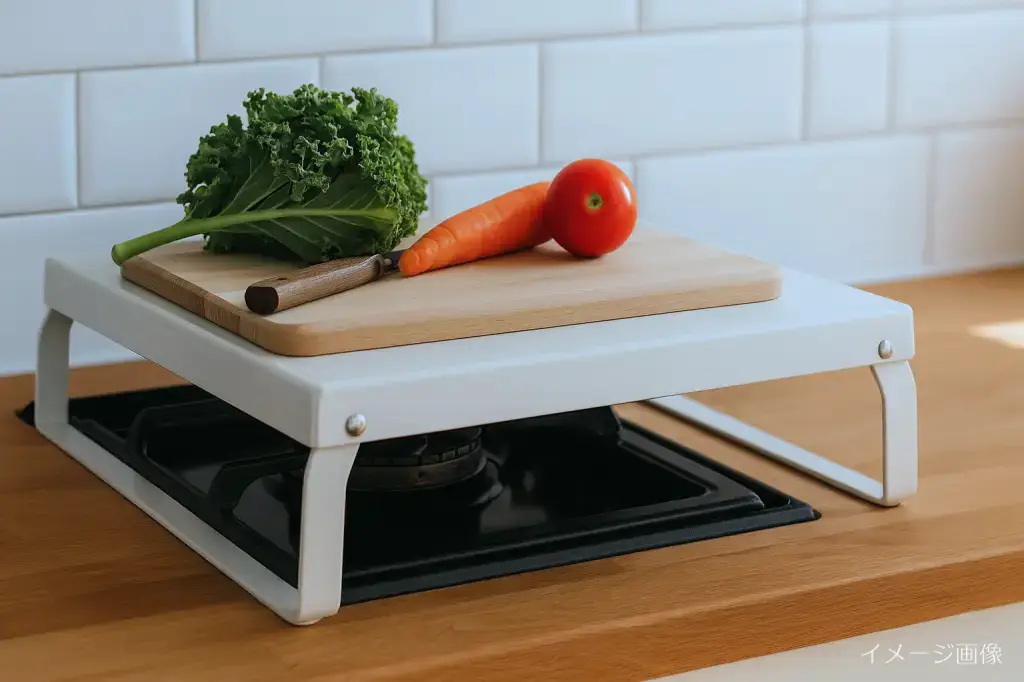 折り畳みガスコンロカバーを使えば、コンロの上を有効活用でき、作業効率が大幅にアップします。